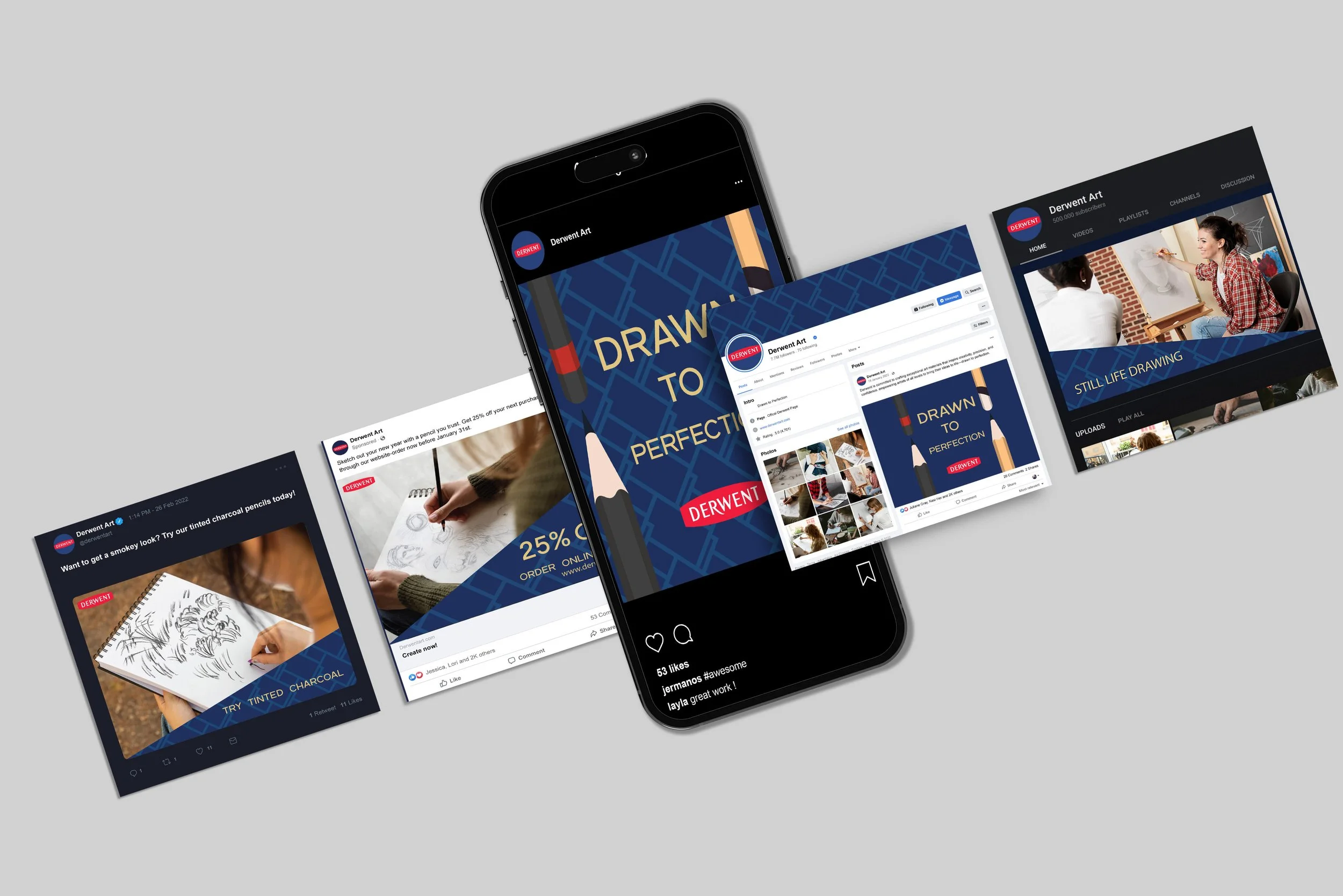 I was tasked with redesigning the packaging for Derwent art supplies, specifically their graphite, colored, and charcoal pencils. Instead of their typical tin containers, I created a drawer-style box to help the packaging stand out from similar products used across multiple brands. The design uses Derwent’s dark blue color palette, accented with a gold ribbon that wraps around the box to bring the design together. I also chose to use simple illustrations of pencils rather than the expressive drawings commonly found on art supply packaging.